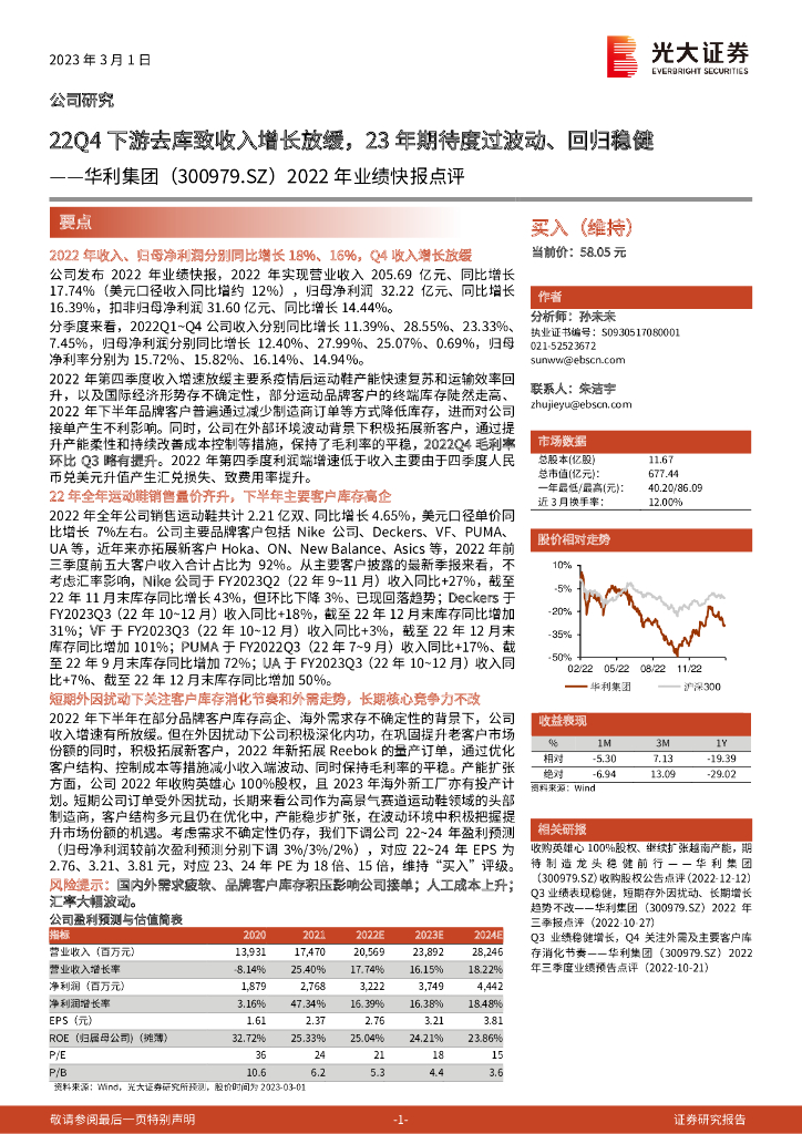 光大证券:华利集团(300979)-2022年业绩快报点评:22Q4下游去库致收入增长放缓,23年期待度过波动、回归稳健.pdf
