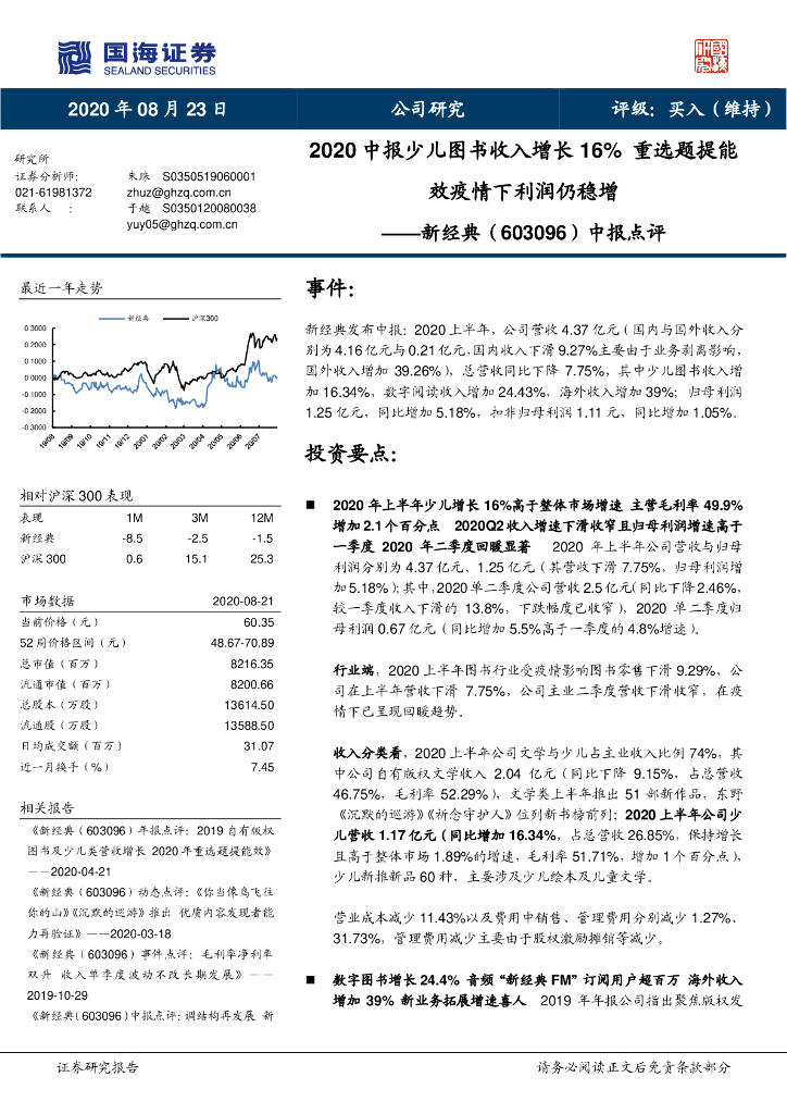 国海证券:新经典(603096)-中报点评:2020中报少儿图书收入增长16% 重选题提能效疫情下利润仍稳增.pdf