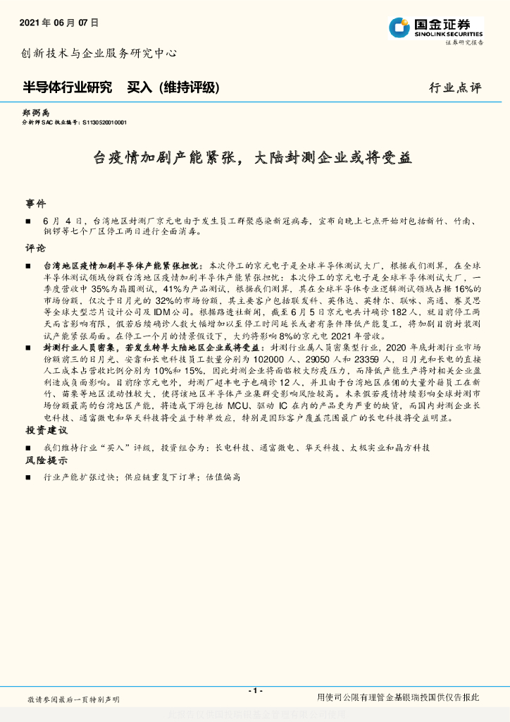 国金证券:半导体行业研究:台疫情加剧产能紧张,大陆封测企业或将受益.pdf