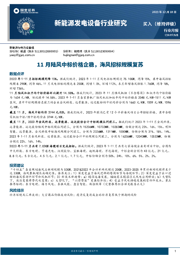 国金证券:新能源发电设备行业月报:11月陆风中标价格企稳,海风招标规模复苏.pdf