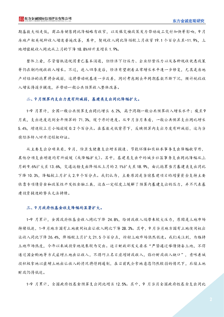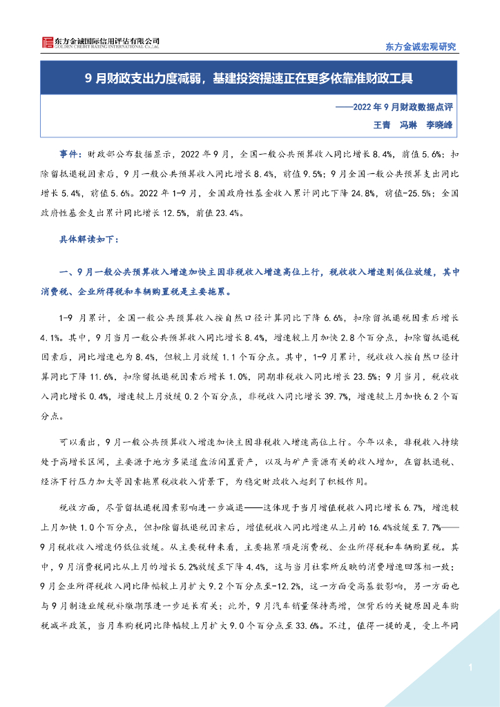 东方金诚:2022年9月财政数据点评-9月财政支出力度减弱,基建投资提速正在更多依靠准财政工具.pdf