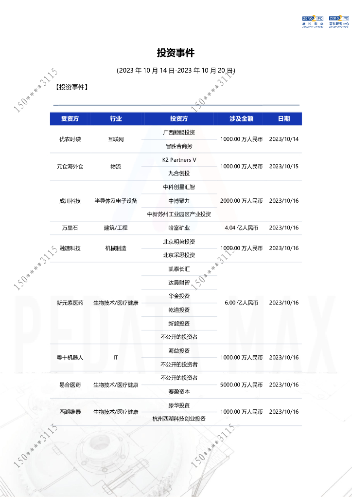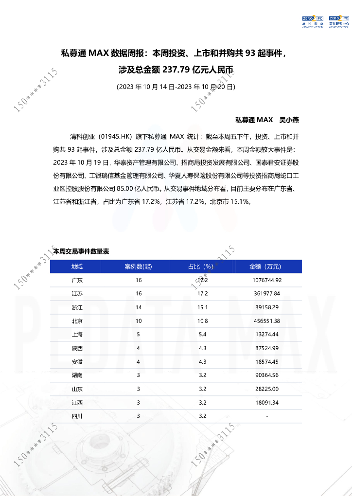 清科研究私募通MAX数据周报:本周投资、上市和并购共93起事件, 涉及总金额237.79亿元人民币 (2023年10月14日-2023年10月20日).pdf