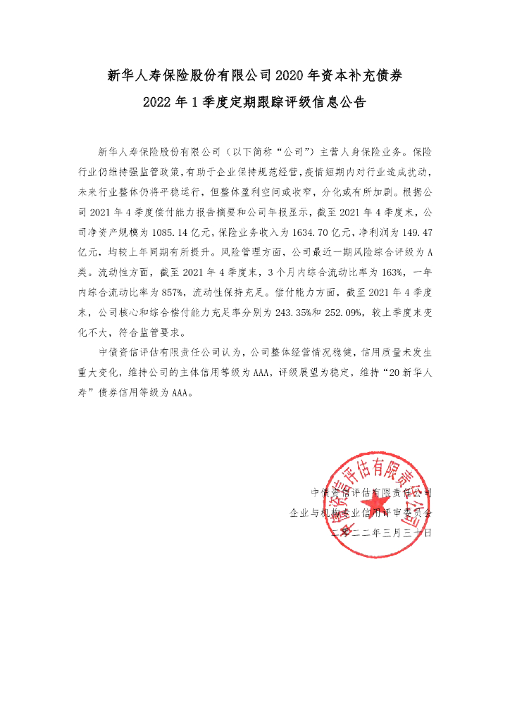中债资信:新华人寿保险股份有限公司2020年资本补充债券2022年1季度定期跟踪评级信息公告.pdf