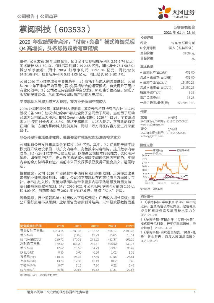 天风证券:掌阅科技(603533)-2020年业绩预告点评:“付费+免费”模式持续兑现Q4高增长,头条加持趋势有望延续.pdf