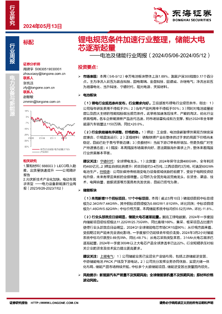 东海证券:电池及储能行业周报:锂电规范条件加速行业整理,储能大电芯逐渐起量.pdf