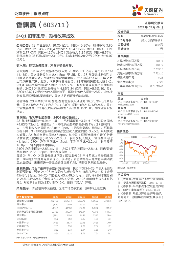 天风证券:香飘飘(603711)-24Q1扣非扭亏,期待改革成效.pdf