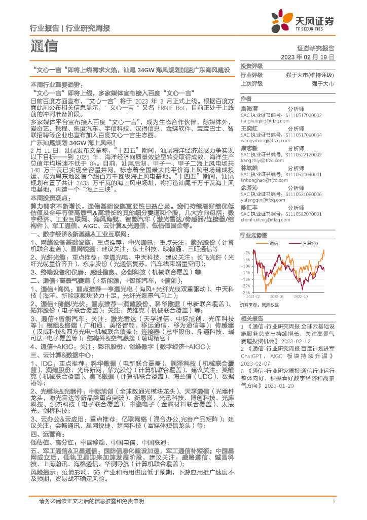 天风证券:通信行业研究周报:“文心一言”即将上线需求火热,汕尾34GW海风规划加速广东海风建设.pdf