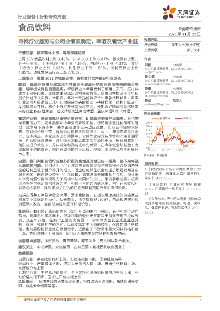天风证券:食品饮料行业研究周报:寻找行业趋势与公司业绩双确定,啤酒及餐饮产业链.pdf