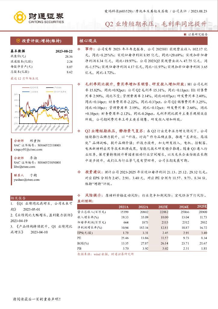 财通证券:爱玛科技(603529)-Q2业绩短期承压,毛利率同比提升.pdf