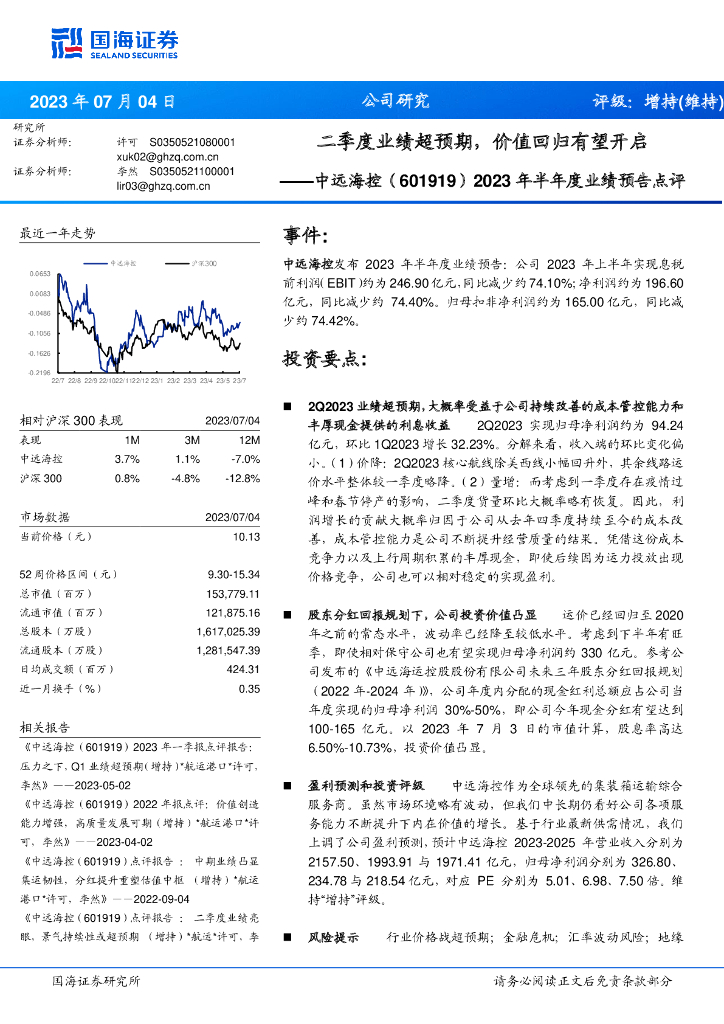 国海证券:中远海控(601919)-2023年半年度业绩预告点评:二季度业绩超预期,价值回归有望开启.pdf