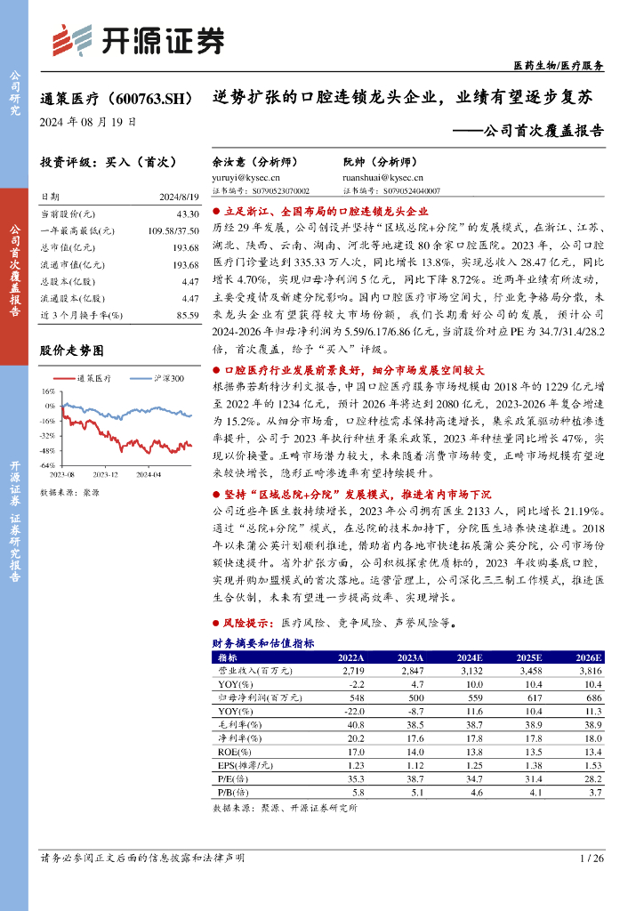 开源证券:通策医疗(600763)-公司首次覆盖报告:逆势扩张的口腔连锁龙头企业,业绩有望逐步复苏.pdf