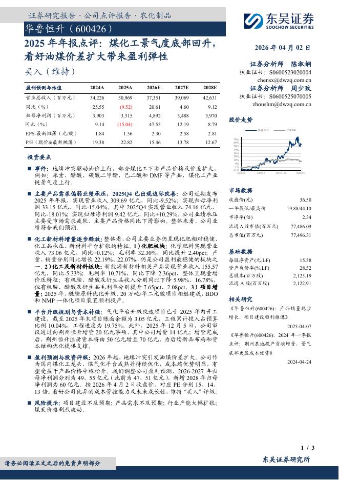 东吴证券:华鲁恒升(600426)-2025年年报点评:煤化工景气度底部回升,看好油煤价差扩大带来盈利弹性.pdf