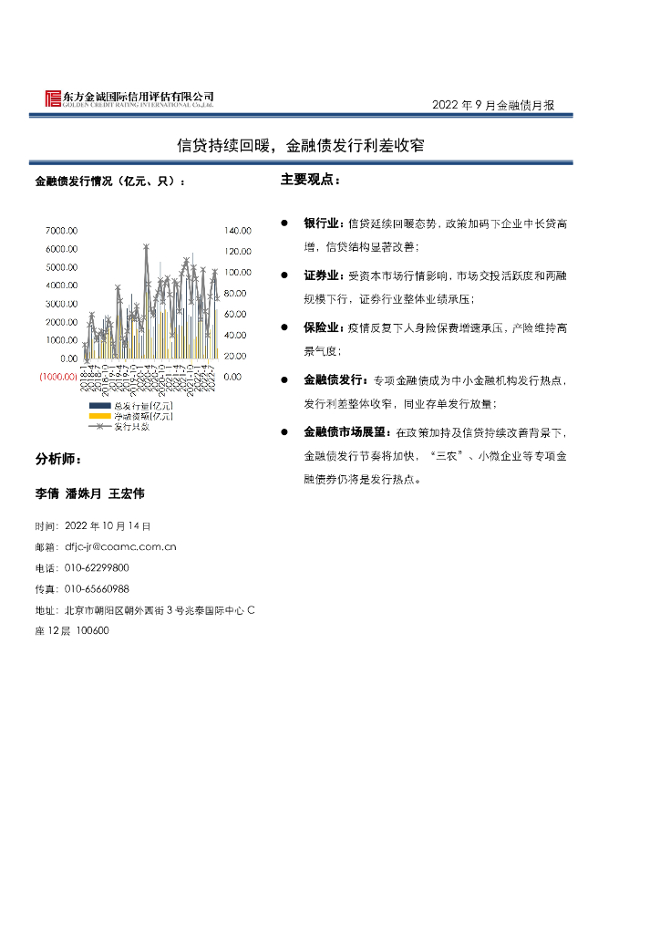 东方金诚:2022年9月金融债月报-信贷持续回暖,金融债发行利差收窄.pdf