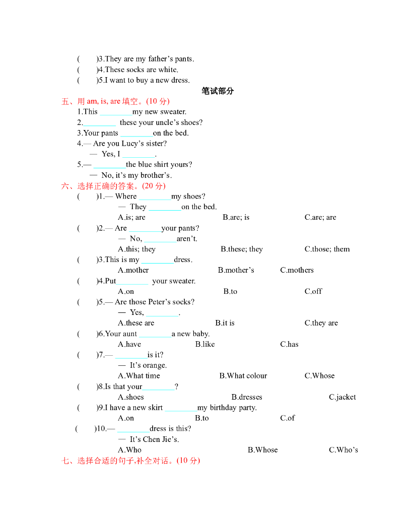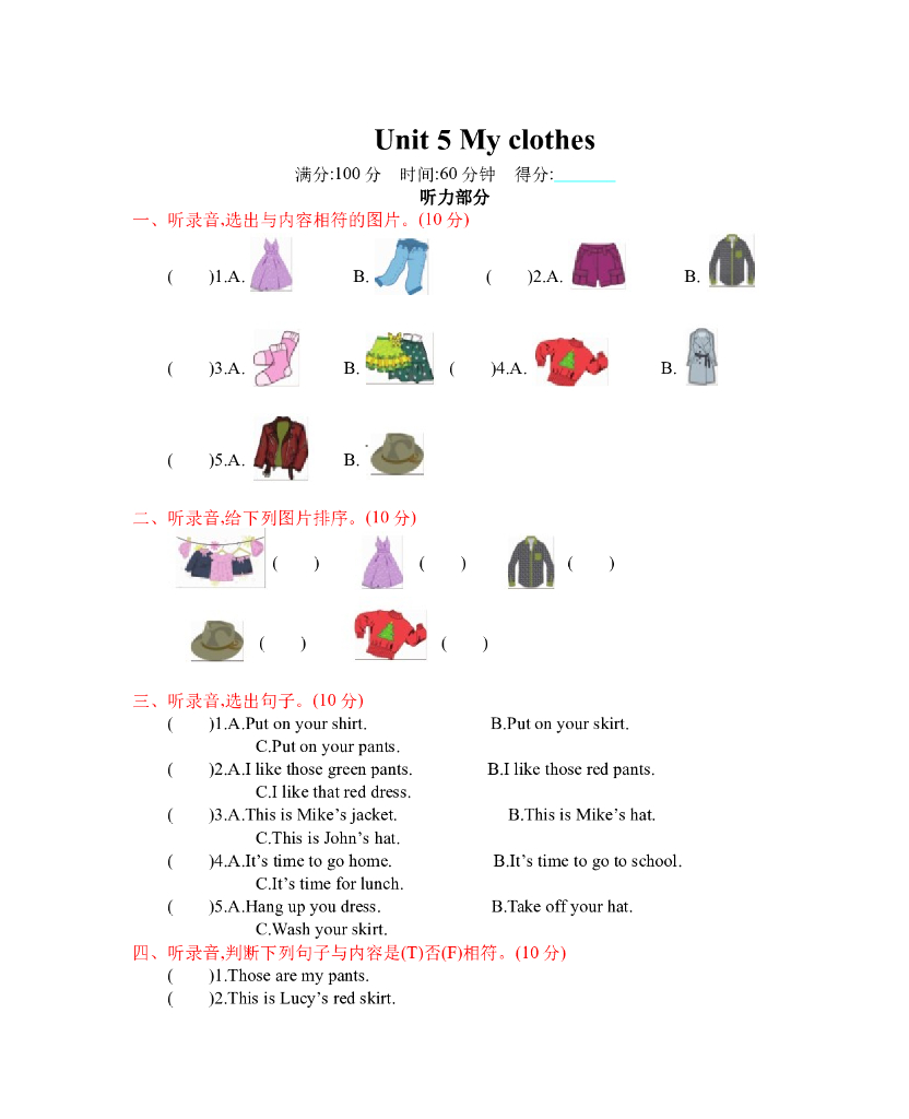 人教四下 Unit 5 单元测试卷.doc
