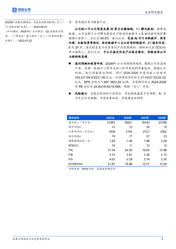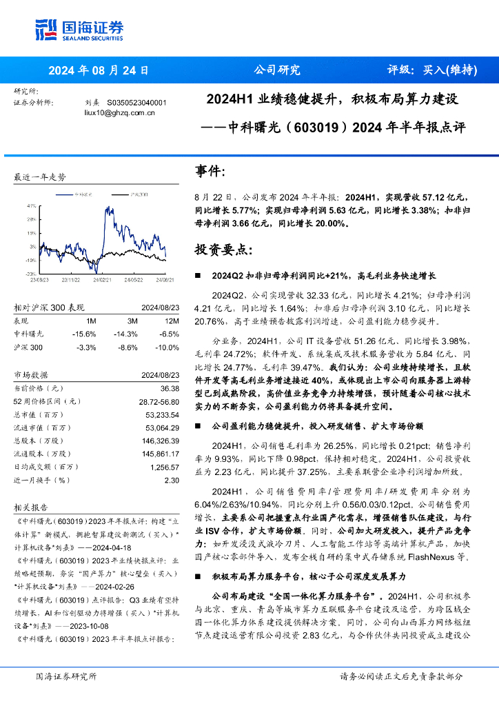 国海证券:中科曙光(603019)-2024年半年报点评:2024H1业绩稳健提升,积极布局算力建设.pdf