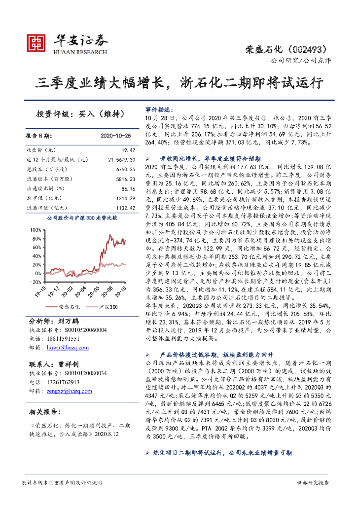 华安证券:荣盛石化(002493)-三季度业绩大幅增长,浙石化二期即将试运行.pdf