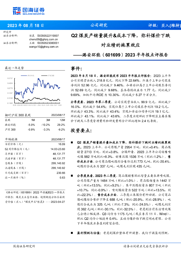 国海证券:潞安环能(601699)-2023半年报点评报告:Q2煤炭产销量提升&成本下降,弥补煤价下跌对业绩的拖累效应.pdf