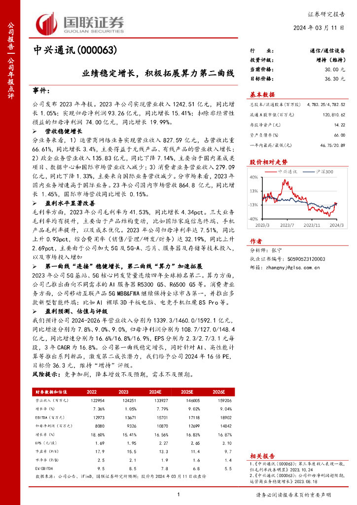 国联证券:中兴通讯(000063)-业绩稳定增长,积极拓展算力第二曲线.pdf