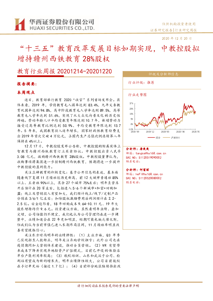 华西证券:教育行业周报:“十三五”教育改革目标如期实现,中教控股拟增持赣州西铁教育28%股权.pdf