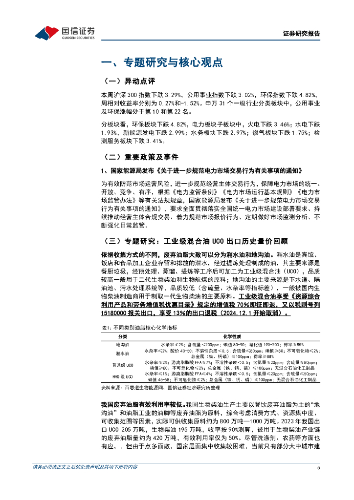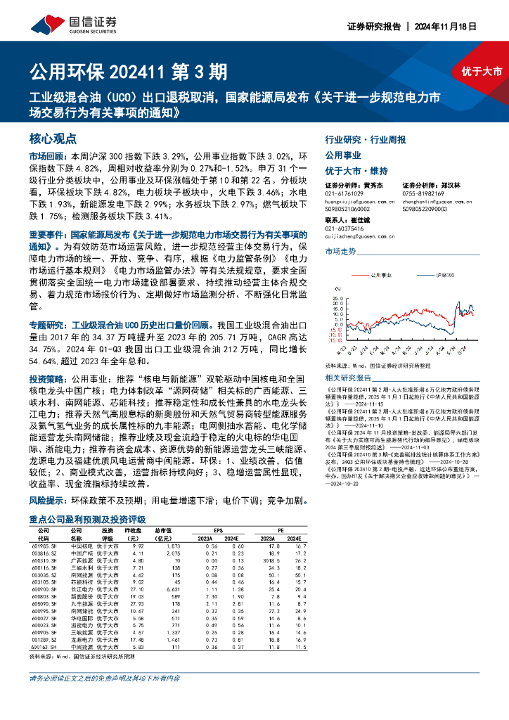 国信证券:公用环保行业202411第3期:工业级混合油(UCO)出口退税取消,国家能源局发布《关于进一步规范电力市场交易行为有关事项的通知》.pdf