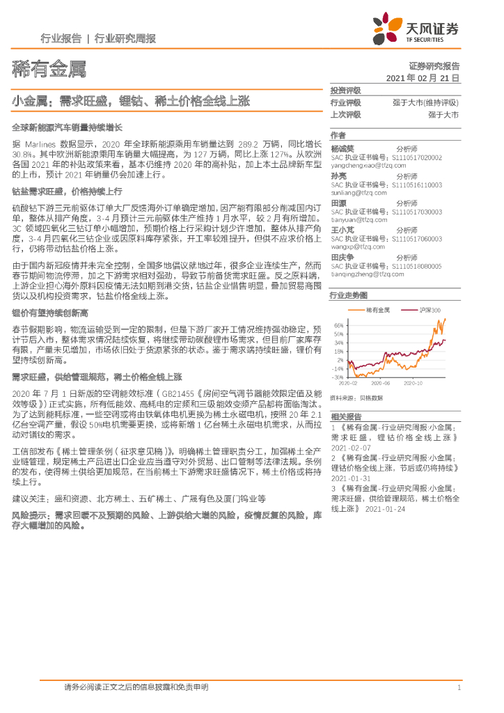 天风证券:稀有金属行业-小金属:需求旺盛,锂钴、稀土价格全线上涨.pdf