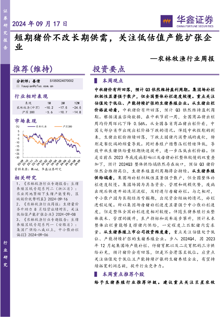 华鑫证券:农林牧渔行业周报:短期猪价不改长期供需,关注低估值产能扩张企业.pdf