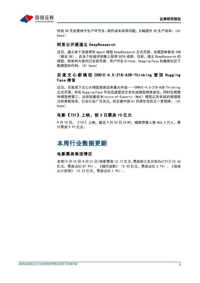 国信证券:传媒互联网行业周报:百度文心新模型登顶HuggingFace,《731》前三日票房近10亿