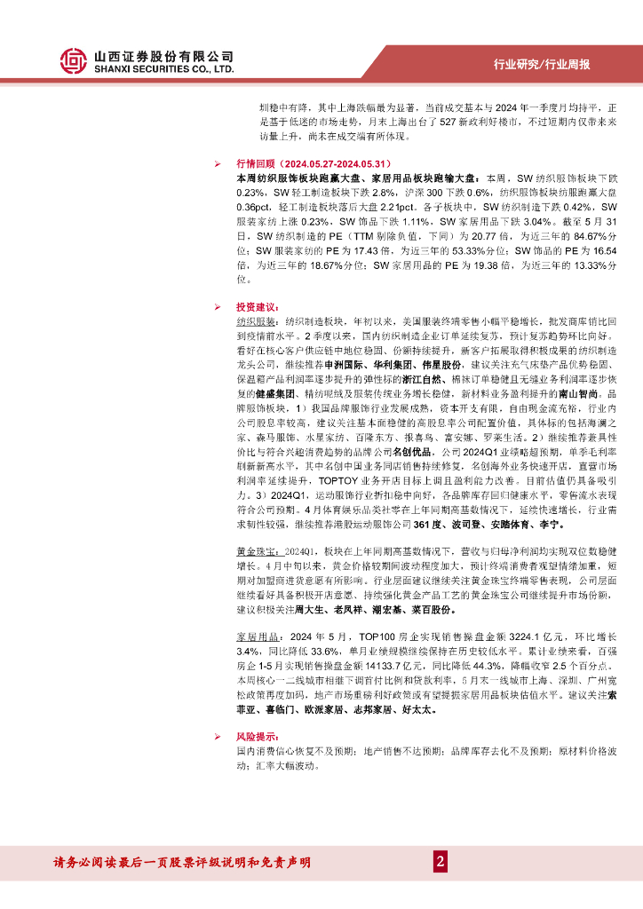 山西证券:纺织服装行业周报:VF集团FY2024收入同降10%,百强房企5月销售额环比增长3%.pdf