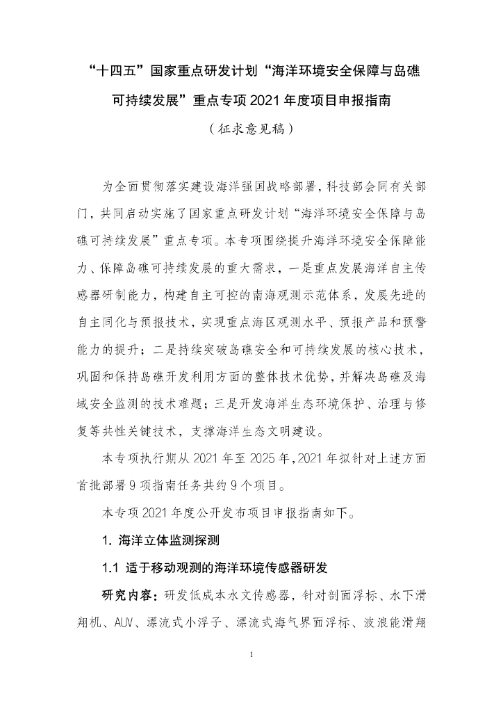 “十四五”国家重点研发计划“海洋环境安全保障与岛礁可持续发展”重点专项2021年度项目申报指南(征求意见稿).pdf