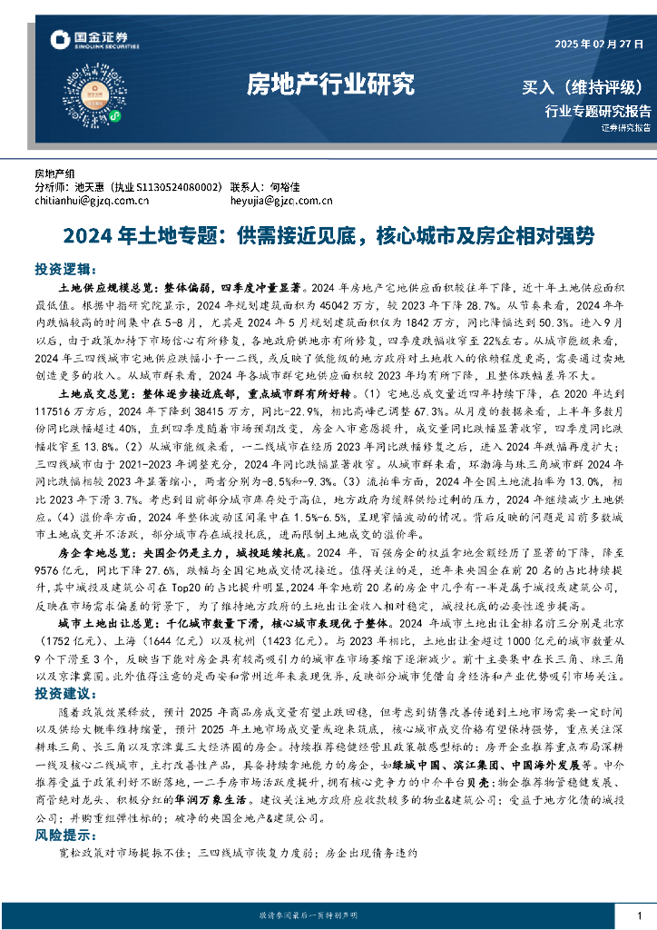 国金证券:2024年土地专题:供需接近见底,核心城市及房企相对强势.pdf