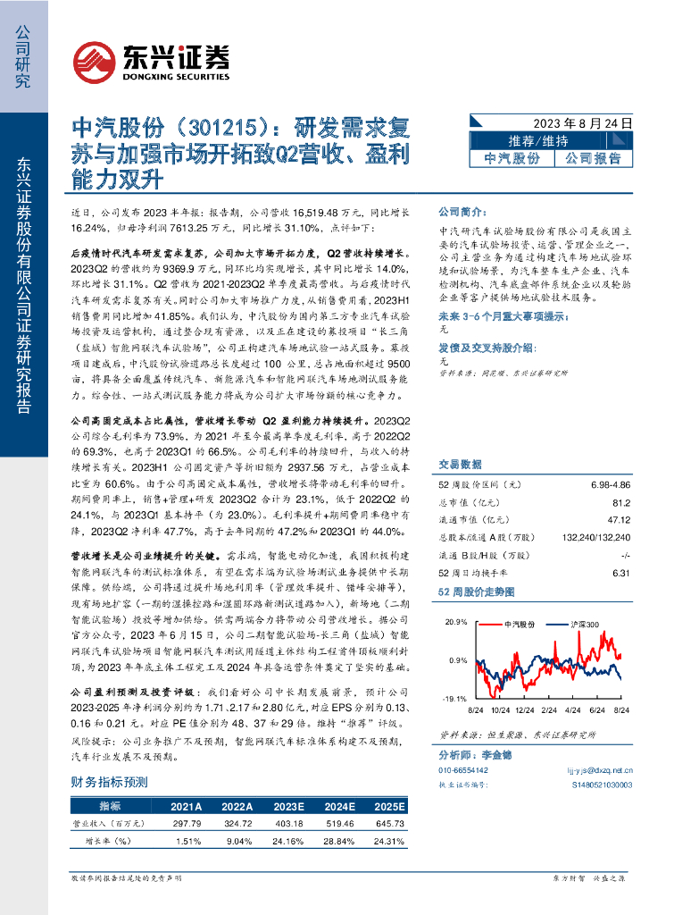 东兴证券:中汽股份(301215)-研发需求复苏与加强市场开拓致Q2营收、盈利能力双升.pdf