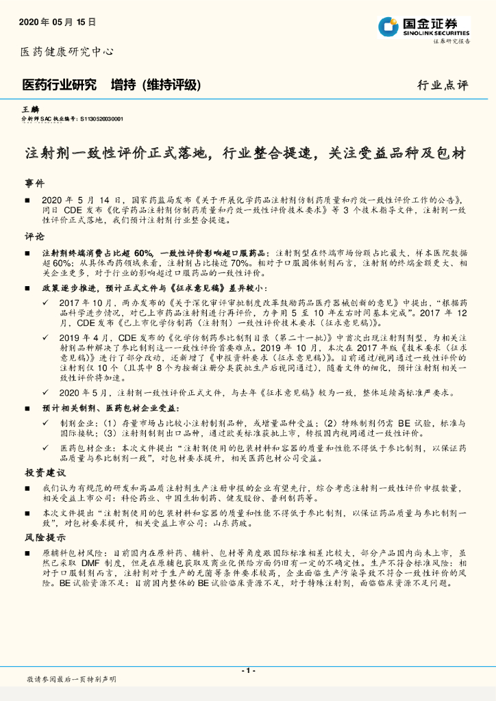 国金证券:医药行业研究:注射剂一致性评价正式落地,行业整合提速,关注受益品种及包材.pdf