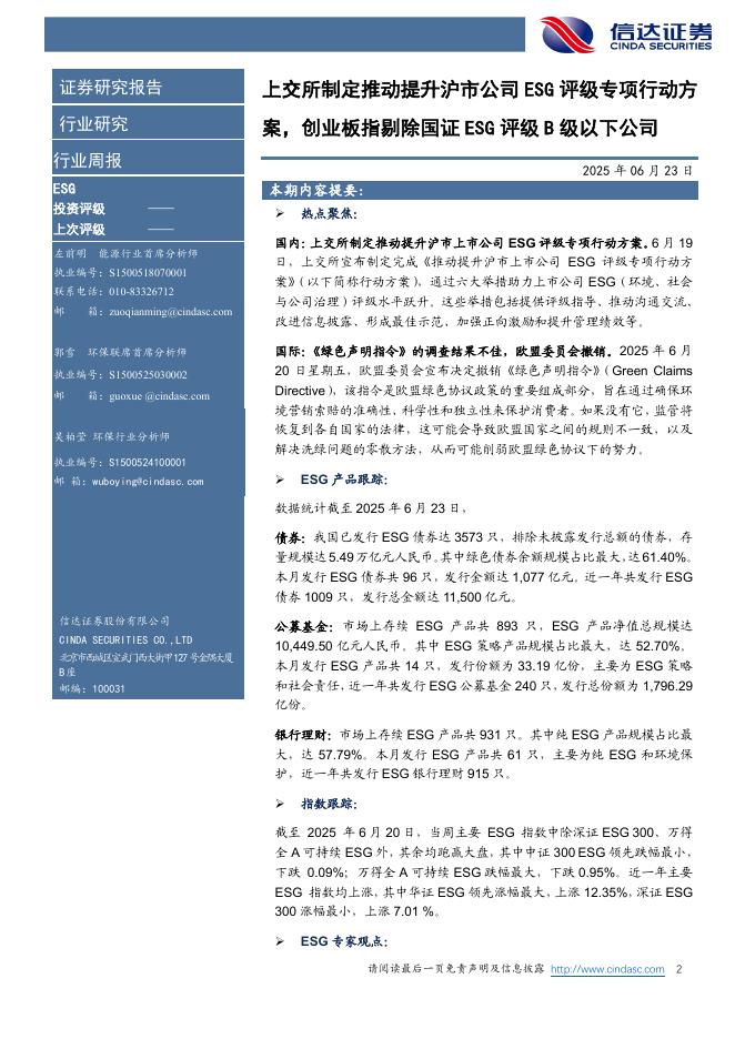 信达证券:ESG周报:上交所制定推动提升沪市公司ESG评级专项行动方案,创业板指剔除国证ESG评级B级以下公司.pdf
