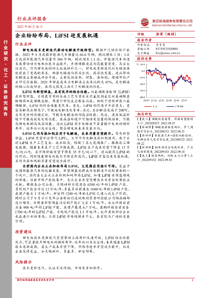 东亚前海证券:化工行业点评报告:企业纷纷布局、LiFSI迎发展机遇.pdf