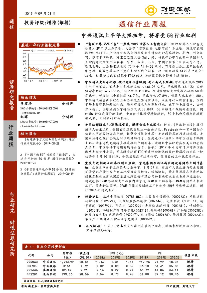 财通证券:通信行业周报:中兴通讯上半年大幅扭亏,将享受5G行业红利.pdf