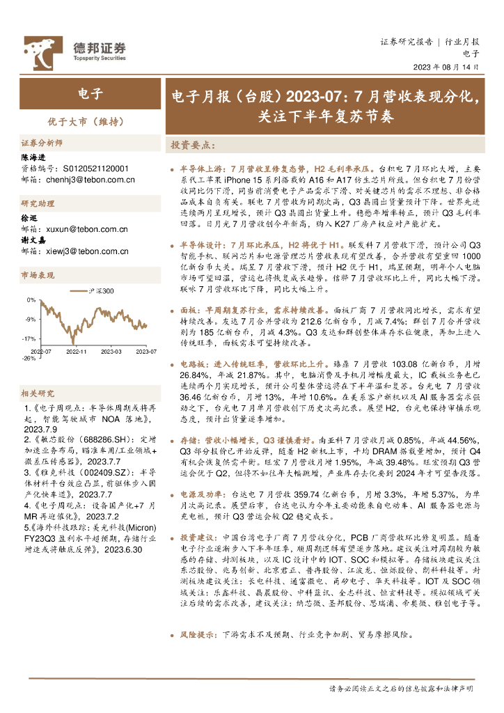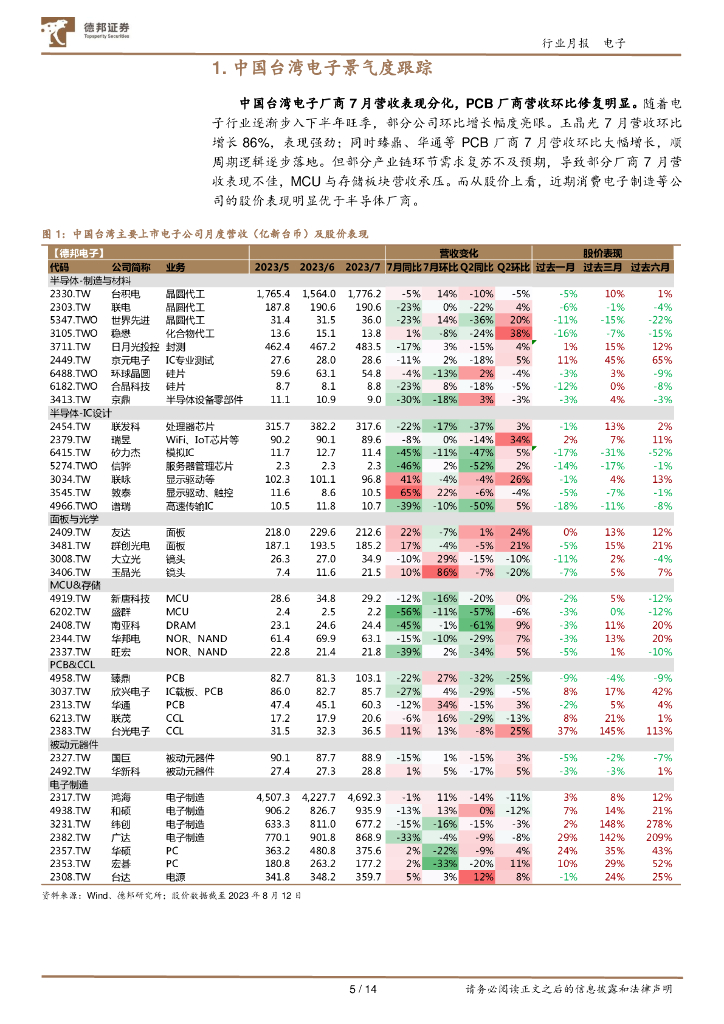 德邦证券:电子月报(台股)2023-07:7月营收表现分化,关注下半年复苏节奏.pdf