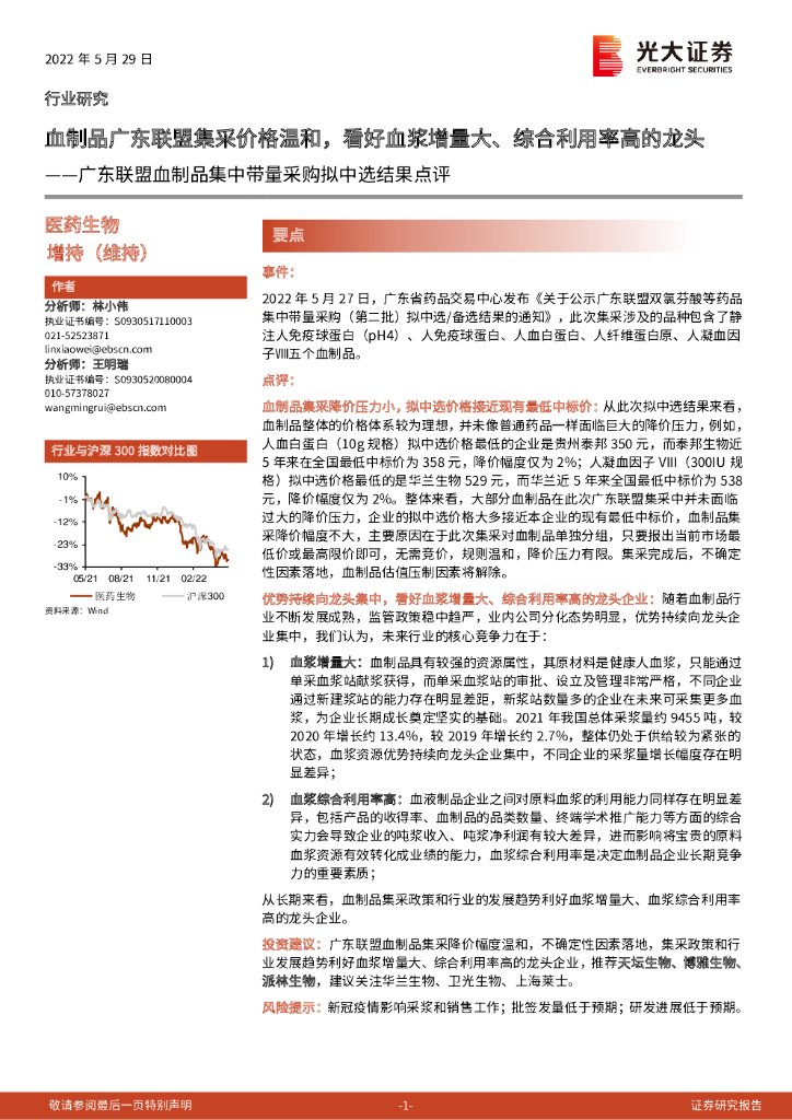 光大证券:医药生物:广东联盟血制品集中带量采购拟中选结果点评-血制品广东联盟集采价格温和,看好血浆增量大、综合利用率高的龙头.pdf