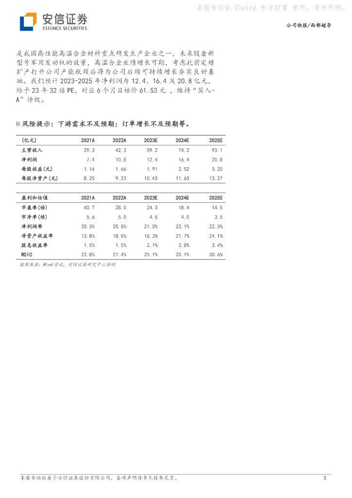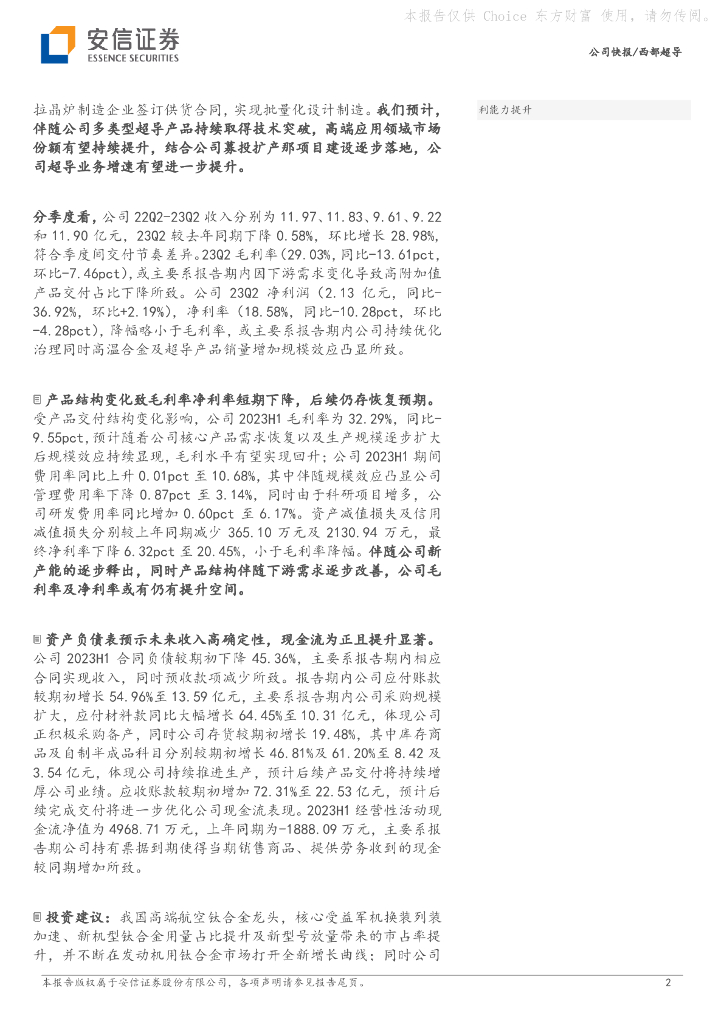 安信证券:西部超导(688122)-2023H1整体收入表现平稳,产品结构差异致短期承压.pdf