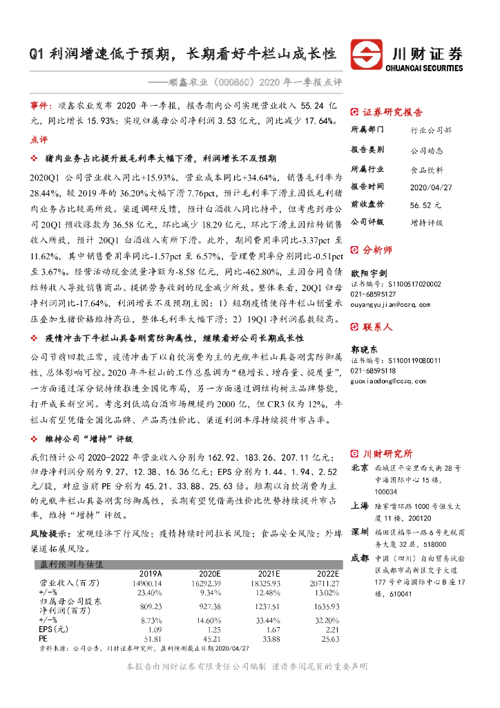 川财证券:顺鑫农业(000860)-2020年一季报点评:Q1利润增速低于预期,长期看好牛栏山成长性.pdf