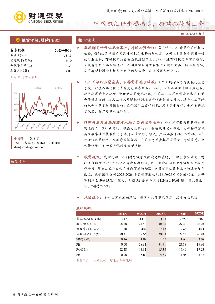 财通证券:美好医疗(301363)-呼吸机组件平稳增长,持续拓展新业务.pdf