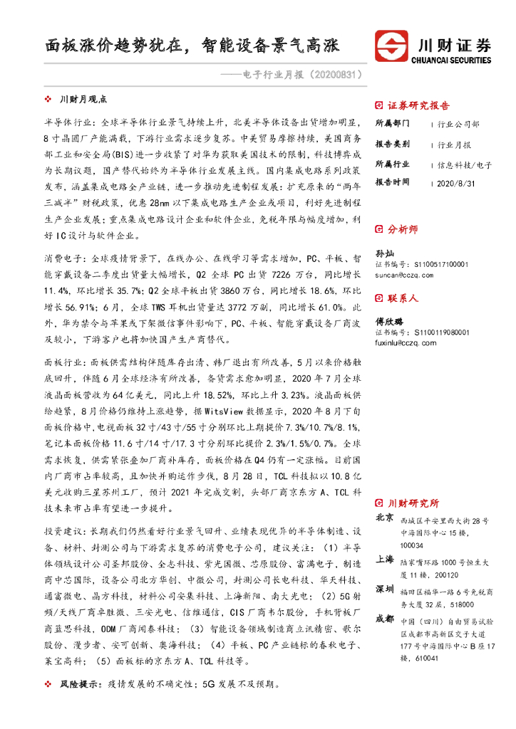 川财证券:电子行业月报:面板涨价趋势犹在,智能设备景气高涨.pdf