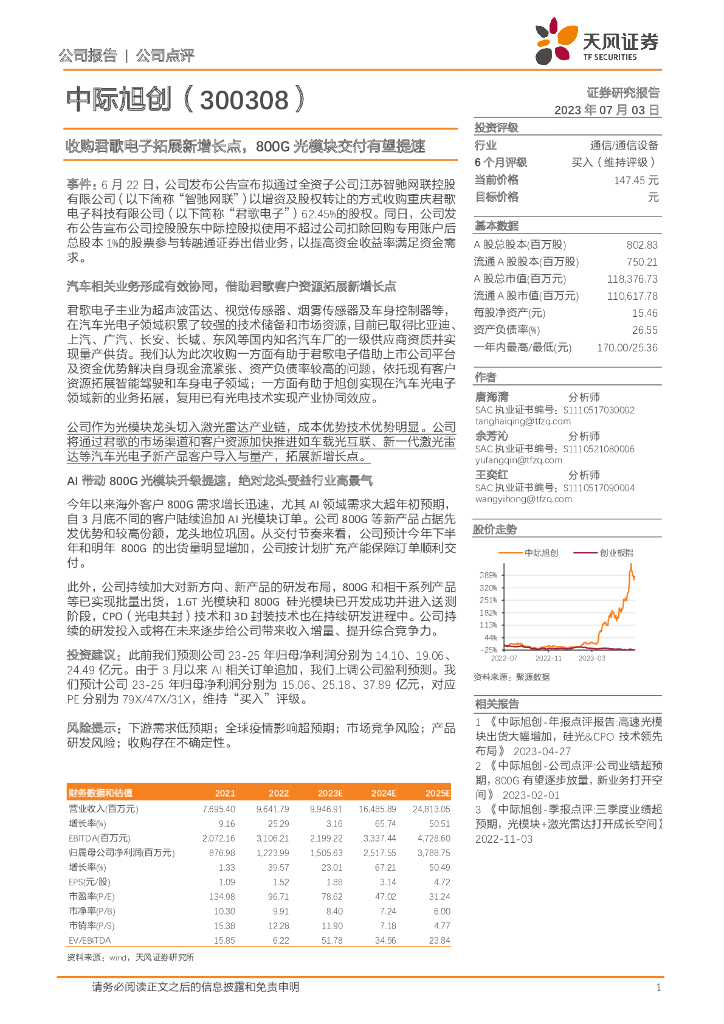 天风证券:中际旭创(300308)-收购君歌电子拓展新增长点,800G光模块交付有望提速.pdf