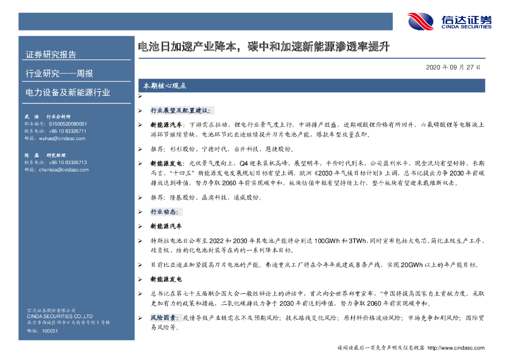信达证券:电力设备及新能源行业周报:电池日加速产业降本,碳中和加速新能源渗透率提升.pdf
