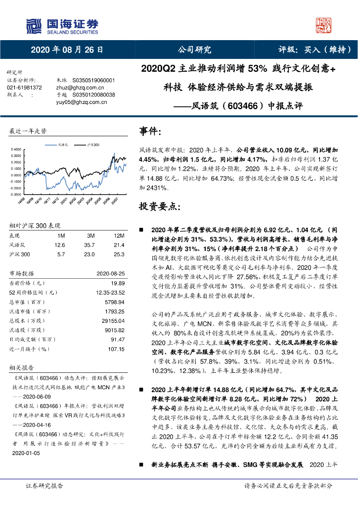 国海证券:风语筑(603466)-中报点评:2020Q2主业推动利润增53% 践行文化创意+科技 体验经济供给与需求双端提振.pdf