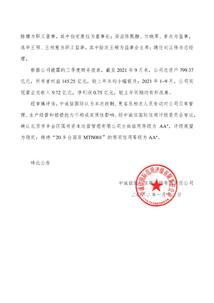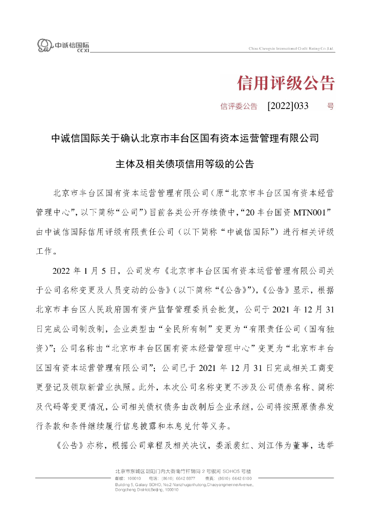 中诚信:中诚信国际关于确认北京市丰台区国有资本运营管理有限公司主体及相关债项信用等级的公告.pdf