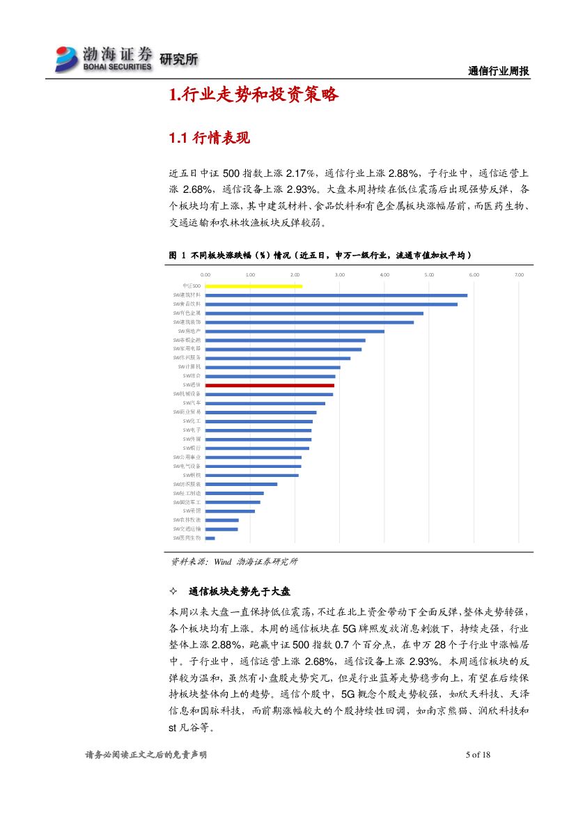 渤海证券:通信行业周报:5G建设周期开启,关注5G产业链前段品种.pdf
