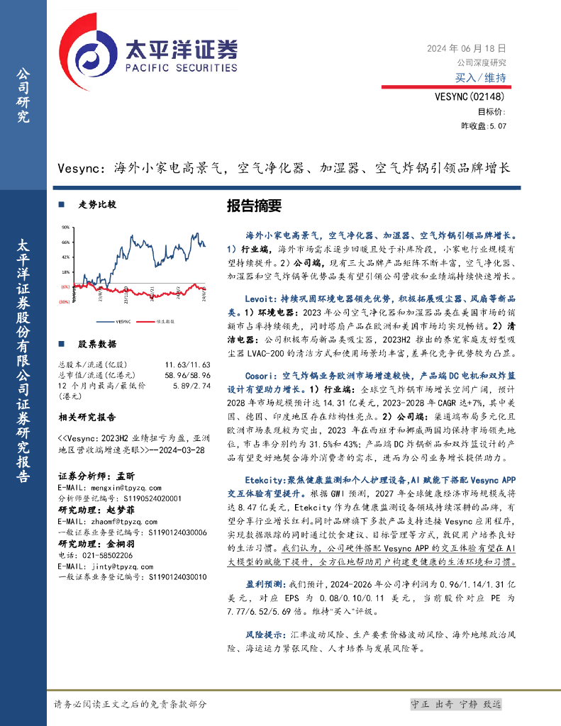 太平洋证券:VESYNC:海外小家电高景气,空气净化器、加湿器、空气炸锅引领品牌增长.pdf