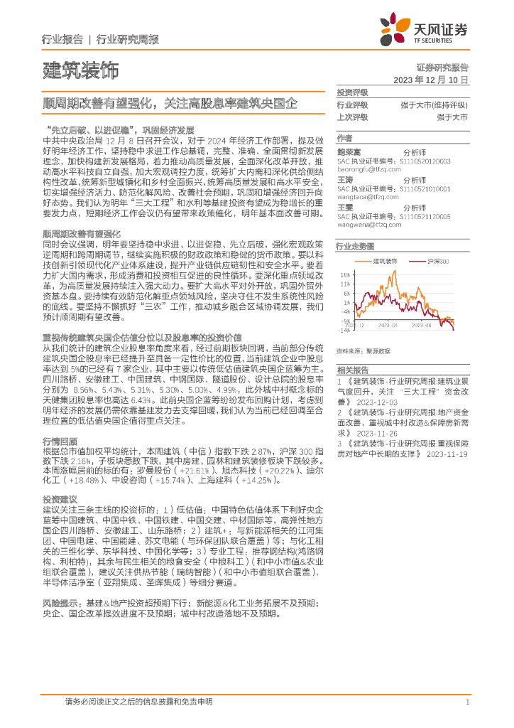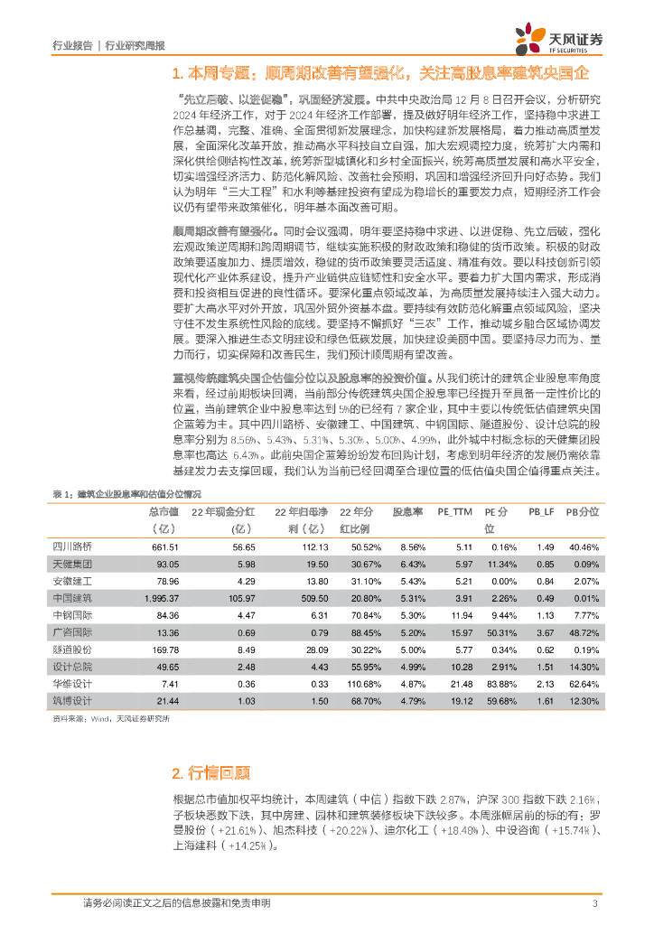 天风证券:建筑装饰行业研究周报:顺周期改善有望强化,关注高股息率建筑央国企.pdf