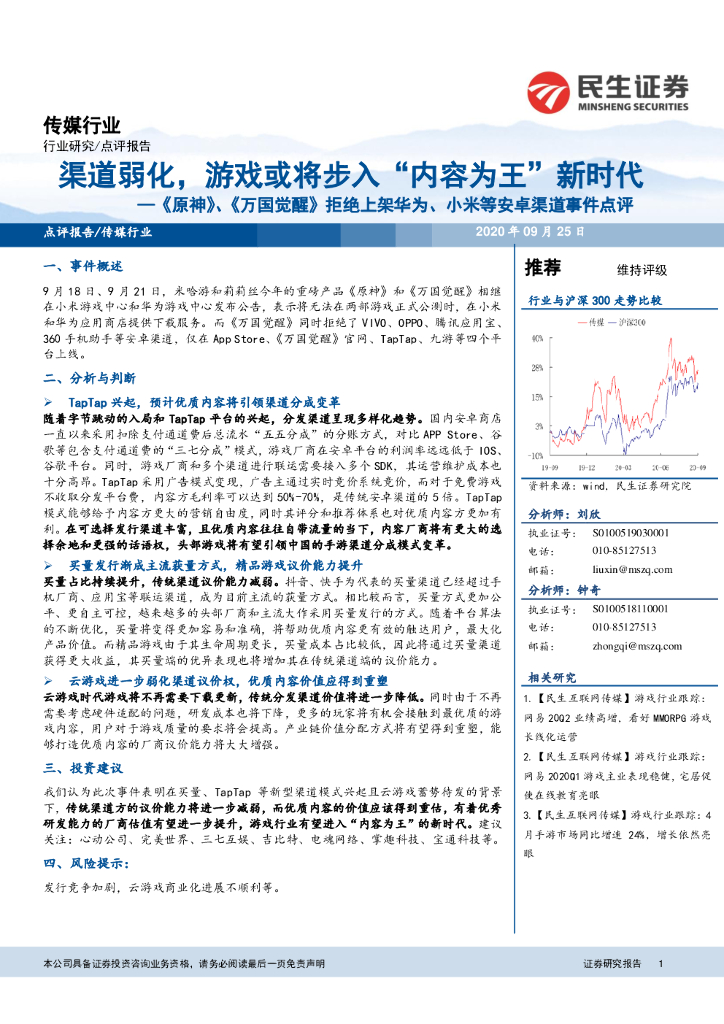 民生证券:传媒行业:《原神》、《万国觉醒》拒绝上架华为、小米等安卓渠道事件点评:渠道弱化,游戏或将步入“内容为王”新时代.pdf