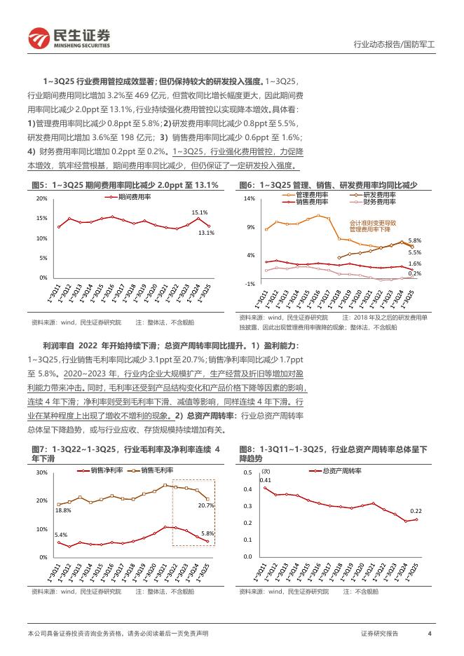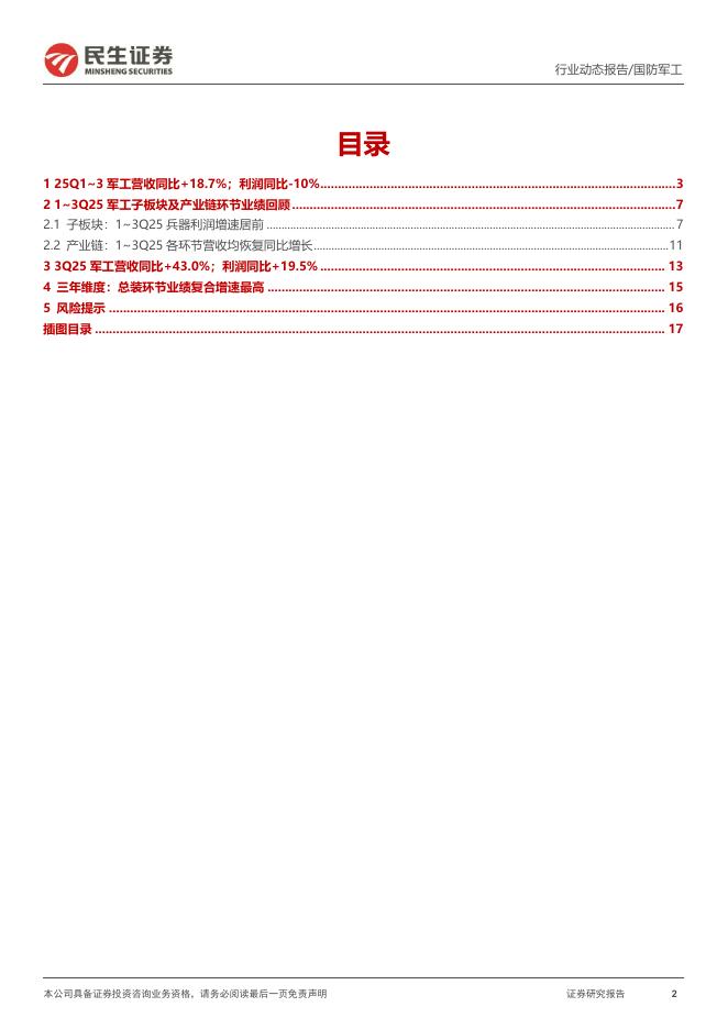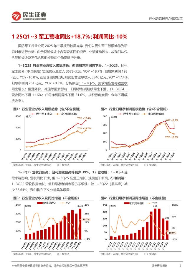 民生证券:军工行业2025年三季报业绩回顾:3Q利润系近9个季度首次正增长;行业回款仍有压力.pdf